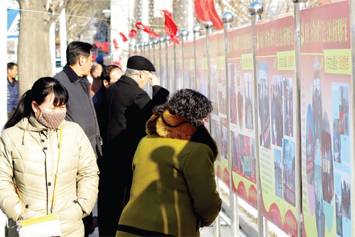 2月21日,忻府區(qū)區(qū)委、區(qū)政府門前“踐行社會主義核心價值觀”圖片展,吸引了眾多市民觀看學(xué)習(xí)。 (張志遠(yuǎn) 攝)