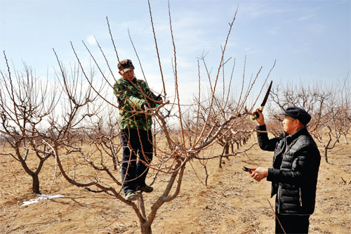 代縣胡峪鄉(xiāng)望臺(tái)村作為全縣優(yōu)質(zhì)干鮮果基地,家家戶戶靠栽植干鮮果樹(shù)發(fā)家致富,現(xiàn)已發(fā)展白水杏、仁用杏1900多畝,去年僅干鮮果一項(xiàng)就收入640萬(wàn)元,全村人均純收入6000余元。嘗到甜頭的果農(nóng)們,正月十五一過(guò)就開(kāi)始著手修剪果樹(shù),期盼今年干鮮果獲得大豐收,將腰包進(jìn)一步鼓起來(lái)。圖為果農(nóng)在修剪果樹(shù)。(石俊文 劉睿 攝)