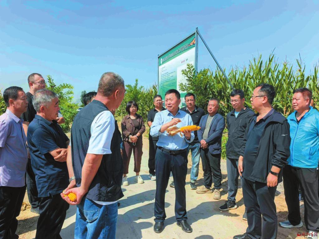 近日,定襄縣2024年玉米單產(chǎn)提升工程項(xiàng)目觀摩會(huì)成功舉辦。這場(chǎng)集成果展示、技術(shù)交流、經(jīng)驗(yàn)分享于一體的活動(dòng),讓種糧戶帶著理論知識(shí)走進(jìn)田間,在實(shí)踐中解碼玉米單產(chǎn)提升的“科技密碼”。圖為山西農(nóng)業(yè)大學(xué)玉米研究所負(fù)責(zé)人正在為參會(huì)者講解玉米單產(chǎn)提升工程的優(yōu)勢(shì)。(本報(bào)通訊員攝)