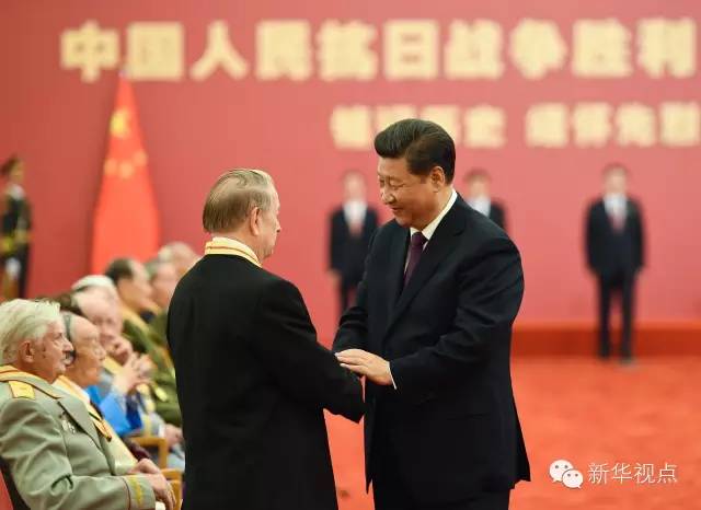 2015年9月2日,習(xí)近平在北京人民大會堂向30名抗戰(zhàn)老戰(zhàn)士老同志、抗戰(zhàn)將領(lǐng)、幫助和支持中國抗戰(zhàn)的國際友人或其遺屬代表頒發(fā)中國人民抗日戰(zhàn)爭勝利70周年紀(jì)念章并發(fā)表重要講話。新華社記者 謝環(huán)馳攝