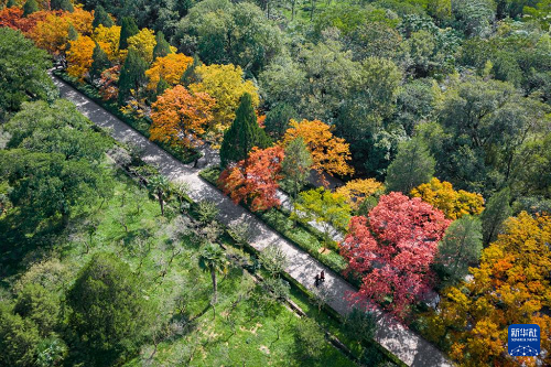 10月23日,游客在江蘇南京明孝陵景區(qū)石象路觀賞秋景(無(wú)人機(jī)照片)。(新華社發(fā) 蘇陽(yáng) 攝)