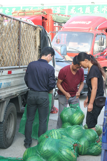 暑期天氣赤日炎炎,8月7日,原平市德金集貿瓜果蔬菜市場大西瓜貨豐價穩(wěn)購銷兩旺,市民們紛紛購買防暑解熱。(趙春曉 攝)