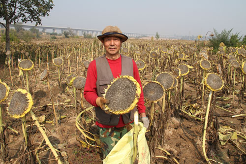 10月13日,原平市解村鄉(xiāng)圪坨村林同種植專業(yè)合作社正在收獲向日葵,該社引進三瑞公司種植1000余畝SH363向日葵喜獲豐收。近年來,該市積極引導農(nóng)民調(diào)整農(nóng)業(yè)產(chǎn)業(yè)結構,采取“合作社+農(nóng)戶”的模式,向日葵比玉米收入高四倍,銷售價每斤4塊左右,合作社為農(nóng)戶提供種子、種植技術等服務,帶動當?shù)厝罕娫鍪罩赂弧?span style="font-family: 楷體,楷體_gb2312, simkai">圖為解村鄉(xiāng)村民趁著秋高氣爽的晴好天氣,在田間地頭葵花籽的情景。(褚震 攝)