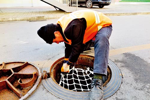 近日,忻州市市政公司組織員工,為城區(qū)道路上的下水井加裝尼龍繩防護網(wǎng)。防護網(wǎng)可承載一個人的重量,可以有效防止行人不慎墜落下水井的事故發(fā)生。圖為市政公司職工正在七一路小學附近的道路上安裝防護網(wǎng)。(魯明強 攝)