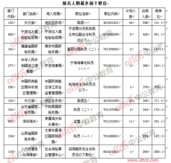 本次計劃招錄2.7萬余人,目前平均競爭比為5.52:1 ,17日的人氣職位與部門都出現(xiàn)了稍有變化。從報名人數(shù)上來看,外交部地區(qū)業(yè)務(wù)司(職位代碼401001001)的職位蟬聯(lián)“人氣之王”。此職位計劃招錄人數(shù)為此次招錄最多,預(yù)計此會成為眾多職位中最閃亮的“人氣之星”。去年同期,報名人數(shù)最多的職位有888人競爭一個崗位,而今年的考生更趨理性,不再“扎堆”報考。寧波出入境檢驗檢疫局(職位代碼601682005),因計劃招錄5人引來426名考生的“青睞”,在報名第三日逆襲成“人氣亞軍”。福建省國家稅務(wù)局(職位代碼701309002)一職,也在17日上午的排行榜中前進2個名次,增加45人報考。