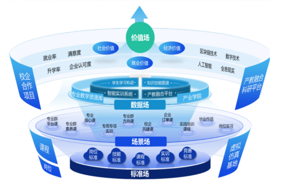 學(xué)院商數(shù)專業(yè)群將“共生”理念融入職教實(shí)踐,提出“四象場(chǎng)域共生”育人模型,構(gòu)建“標(biāo)準(zhǔn)場(chǎng)—場(chǎng)景場(chǎng)—數(shù)據(jù)場(chǎng)—價(jià)值場(chǎng)”四維聯(lián)動(dòng)機(jī)制: