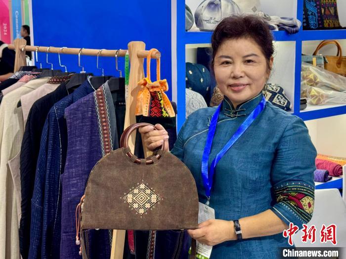10月13日,來(lái)自海南的琴韻幽蘭品牌設(shè)計(jì)師王彬妮展示黎錦元素面料制成的產(chǎn)品。董易鑫 攝