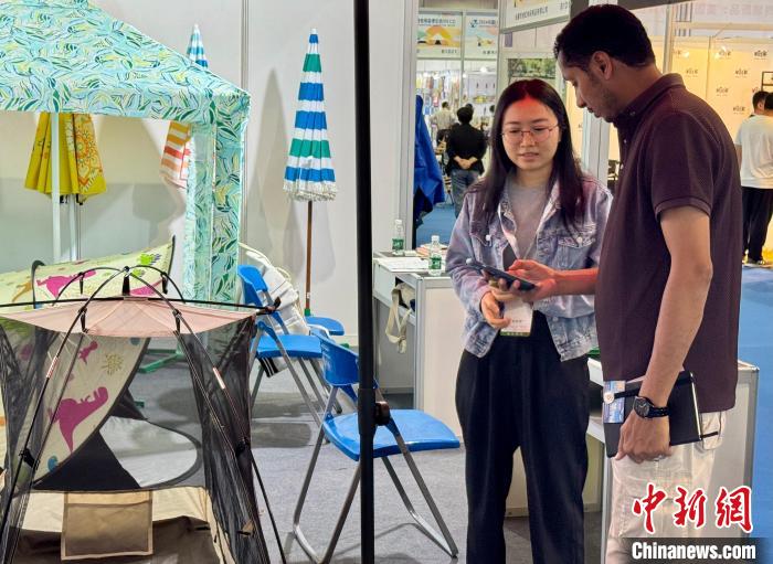 10月13日,一位外商(右一)在中國(guó)義烏文化和旅行產(chǎn)品交易博覽會(huì)了解戶外產(chǎn)品。董易鑫 攝