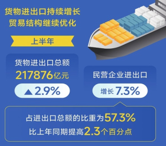 貨物進出口持續(xù)增長,貿(mào)易結(jié)構(gòu)繼續(xù)優(yōu)化。上半年,貨物進出口總額217876億元,同比增長2.9%。民營企業(yè)進出口增長7.3%,占進出口總額的比重為57.3%,比上年同期提高2.3個百分點。