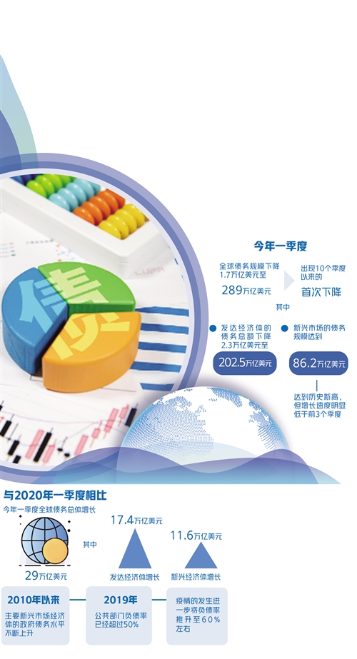 日前,國際金融協(xié)會發(fā)布了最新的全球債務(wù)監(jiān)測報告。好消息是全球債務(wù)規(guī)模在2021年一季度出現(xiàn)10個季度以來的首次下降;壞消息是全球債務(wù)規(guī)模體量巨大、償債能力不均衡等問題依然存在。