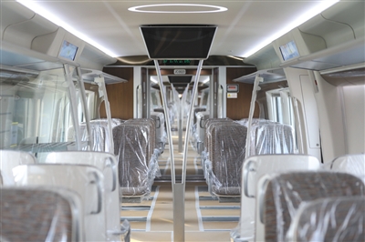 目前列車(chē)設(shè)計(jì)載客量為每平方米9人,列車(chē)最大載客量為1500人左右。為保證舒適度,車(chē)廂設(shè)計(jì)得更加寬敞明亮。車(chē)廂設(shè)計(jì)寬3.3米,普通車(chē)設(shè)置雙排座椅,商務(wù)車(chē)設(shè)置2+1座椅,為方便乘客放置隨身攜帶的行李,加寬了座椅前后的距離,普通列車(chē)座椅前后寬度1.03米,商務(wù)車(chē)廂有1.25米。