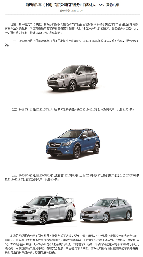 從召回原因來看,本月斯巴魯涉及132954輛汽車的召回不僅數(shù)量最大,召回原因也頗具“創(chuàng)意”。該批車輛因剎車燈開關(guān)接觸方式不合理,受車內(nèi)清掃用品、化妝品等物品揮發(fā)出的含硅氣體的影響,在剎車燈開關(guān)接觸點處生成絕緣薄膜時,可能造成剎車燈開關(guān)相關(guān)的功能(剎車燈、P檔解除、發(fā)動機點火、VDC動態(tài)控制系統(tǒng)、EyeSight駕駛輔助系統(tǒng))失效,同時警示燈點亮;車輛行駛過程中剎車時如果剎車燈無法點亮,可能造成后車追尾事故,存在安全隱患。