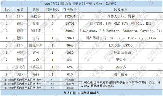 根據(jù)國家市場監(jiān)督管理總局缺陷產(chǎn)品管理中心3月份發(fā)布的召回公告,經(jīng)濟日報-中國經(jīng)濟網(wǎng)汽車頻道經(jīng)過匯總、統(tǒng)計,整理出“2019年3月國內(nèi)乘用車召回榜單”。3月,國內(nèi)乘用車市場共有9個品牌累計發(fā)布9起召回公告,共計召回汽車316084輛,同比下降12.39%,環(huán)比增長156.02%。