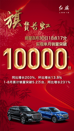 據紅旗官宣,紅旗品牌單月銷量已突破10000輛,同比增長203%,環(huán)比增長13.8%,至此,1-8月累計實現(xiàn)銷量5.2萬輛,同比增長231%。單月突破10000輛的成績,使紅旗首次躋身月銷萬輛俱樂部。