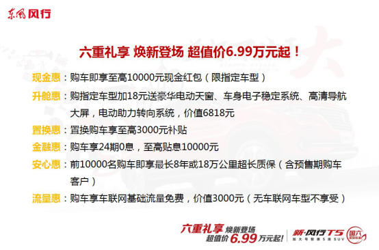 除此之外,為讓新風(fēng)行T5的用戶能夠享受踏實無憂的購車、用車生活,東風(fēng)風(fēng)行貼心準(zhǔn)備六重“禮享”,包括現(xiàn)金惠、升艙惠、置換惠、金融惠、安心惠、流量惠等,力度十足。