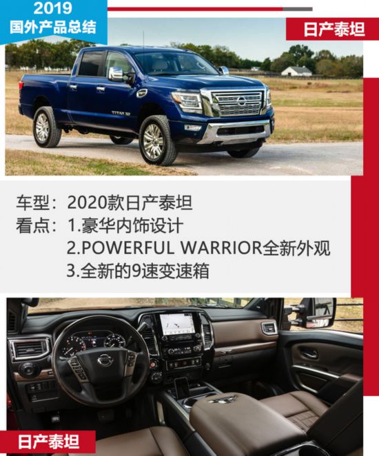 2019年9月,2020款日產(chǎn)泰坦正式發(fā)布,與其說是換代,不如說只是第二代H61的一次小的改款,仍然采用日產(chǎn)F-Alpha平臺。外觀上,日產(chǎn)稱其為“Powerful Warrior”,能從中看到此前概念車日產(chǎn)泰坦Warrior的影子。外觀上更加激進,動力上,將會提供一款升級的V8汽油發(fā)動機,最大功率298kW,最大扭矩559N·m。原先的7速變速箱直接升級到了全新的9速變速箱,將提供“更平滑、以及更快的加速”。而且,在TitanXD上搭載的康明斯5.0升V8也將和消費者說再見。