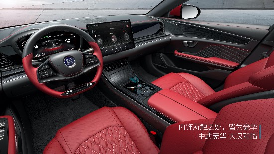 漢整體基于Dragon Face設計語言打造,外觀造型采用雙龍并型·性能美學設計語言,內(nèi)飾采用環(huán)抱式品格設計語言。內(nèi)飾設計,左右對稱的品字形布局營造出和諧大方的中式豪華內(nèi)涵。內(nèi)飾材質(zhì)工藝、色彩紋理把握有度,Nappa真皮、天然真木、真鋁等高級材質(zhì)恰到好處的使用。