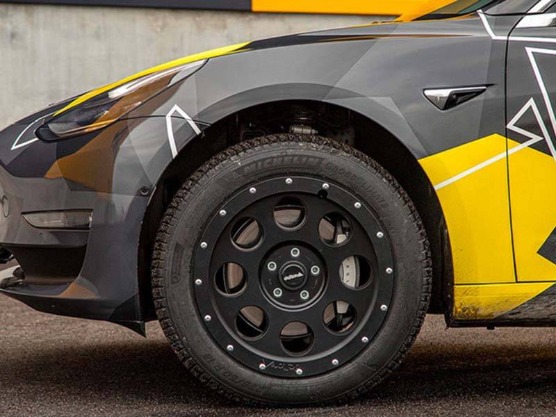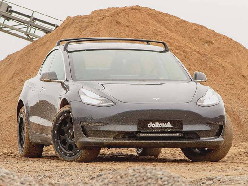 細(xì)節(jié)來(lái)看,該車由德國(guó)Delta 4×4公司打造,新車分別在四個(gè)尺寸為18×8.5的定制車輪上安裝了35毫米的舉升套件,使得Model 3具有40 mm的額外離地間隙。此外,全黑輪轂以及加裝的行李架都使Model 3顯得更加硬派。