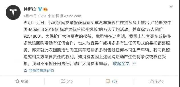 特斯拉在微博上對(duì)于拼多多“團(tuán)購(gòu)”的聲明截圖。