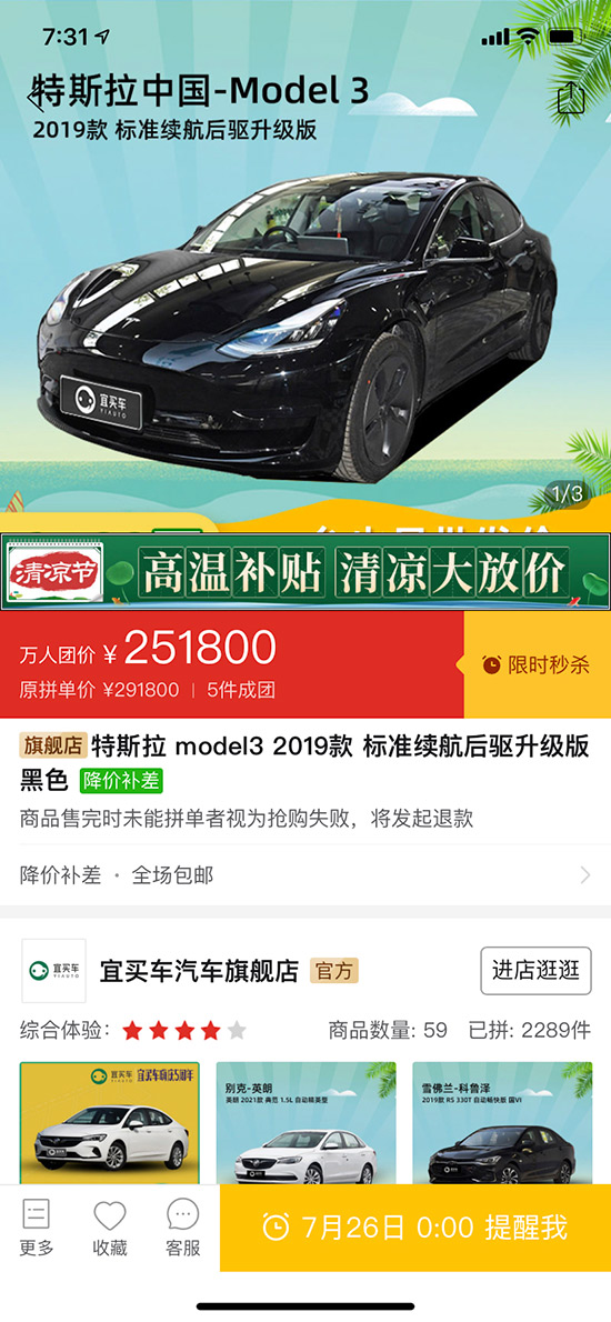 今年7月21日,連鎖汽車銷售平臺(tái)宜買車聯(lián)合拼多多推出了一場(chǎng)特斯拉萬人團(tuán)購(gòu)活動(dòng)?;顒?dòng)期間,特斯拉官方指導(dǎo)價(jià)為27.155萬元的特斯拉Model 3 標(biāo)準(zhǔn)續(xù)航后輪驅(qū)動(dòng)升級(jí)版 ,在拼多多平臺(tái)上的團(tuán)購(gòu)價(jià)為每臺(tái)25.18萬元,團(tuán)購(gòu)價(jià)格比官方售價(jià)便宜了近2萬元。