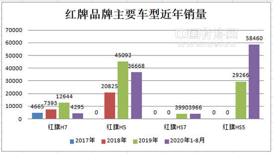 3個月后(2018年4月),新紅旗品牌戰(zhàn)略下的首款力作——H5正式上市。一改以往“官車”的形象,紅旗H5以年輕化的設(shè)計和智能化的配置,成功地俘獲了年輕消費者的芳心,讓紅旗真正“飛入尋常百姓家”。2018年,紅旗H5累計銷售超過2萬輛;2019年,累計銷售4.5萬輛,同比增長125%;今年前8個月,累計銷售3.67萬輛。