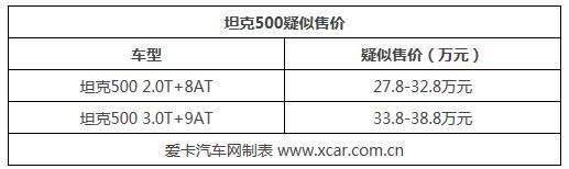 此次曝光的疑似售價中,還曝光了坦克500將搭載2.0T+8AT變速箱車型,這一點與此前的消息不太吻合。此前曝光,坦克500將搭載長城最新的3.0T+9AT變速箱,疑似售價為33.8-38.8萬元。而2.0T+8AT車型的推出更多的是降低坦克500車系的售價,將其起售價下降至30萬元以內(nèi),哈弗H9已經(jīng)迎來的中期改款,售價為21.48-37.98萬元,同樣搭載了2.0T+8AT動力,如果動力相同哈弗H9不香嗎?