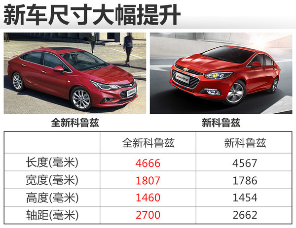 全新科魯茲采用通用全新中級平臺打造,整車長寬高分別為4,666*1,807*1,460毫米,軸距為2,700毫米。車身長度與軸距相比現(xiàn)款車型,分別增加99和38毫米。對于同級別車型大眾速騰,全新科魯茲車身長度與軸距分別超出11和49毫米。乘坐空間將得到進(jìn)一步的提升。