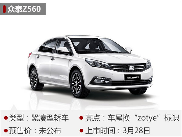 Z500是眾泰汽車旗下一款緊湊型轎車,其改款車型Z560將于3月28日正式上市。外觀方面,新車前臉保留雙橫幅式進(jìn)氣格柵及鷹眼式前大燈組合,視覺效果比較大氣。而新車尾部則取消牌照框上方的Z型LOGO,更換為眾泰最新的“zotye”字樣標(biāo)識。內(nèi)飾方面,眾泰Z560儀表盤有所升級,增加了帶有行車電腦的中間液晶屏幕。新車將延用1.5T動力系統(tǒng),匹配5擋手動變速箱或CVT自動變速箱。其中,搭配手動變速箱車型最大功率將達(dá)105kW,峰值扭矩207Nm。