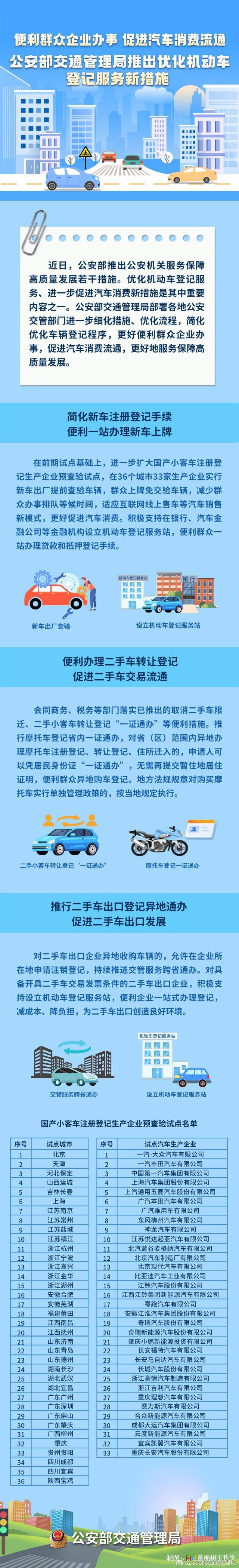 簡化新車注冊登記手續(xù),便利一站辦理新車上牌。在前期試點基礎(chǔ)上,進一步擴大國產(chǎn)小客車注冊登記生產(chǎn)企業(yè)預查驗試點,在36個城市33家生產(chǎn)企業(yè)實行新車出廠提前查驗車輛,群眾上牌免交驗車輛,減少群眾辦事排隊等候時間,適應互聯(lián)網(wǎng)線上售車等汽車銷售新模式,更好促進汽車消費。積極支持在銀行、汽車金融公司等金融機構(gòu)設(shè)立機動車登記服務站,便利群眾一站辦理貸款和抵押登記手續(xù)。