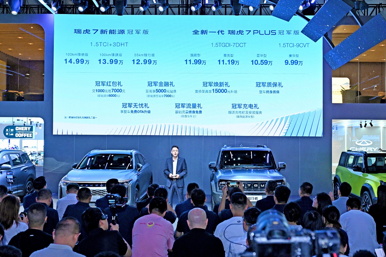 央廣網北京8月25日消息 第二十六屆成都國際汽車展覽會(以下簡稱成都車展)在中國西部國際博覽城正式開幕,奇瑞旗下插電式混動車型「瑞虎7新能源冠軍版」正式迎來上市。新車定位于“12萬級強動力電混SUV”,共推3款車型,售價12.99萬-14.99萬元。針對購車用戶,奇瑞汽車還推出“現金禮、金融禮、置換禮”等8大購車禮遇,助力用戶輕松開啟超越以往的極致混動出行體驗。