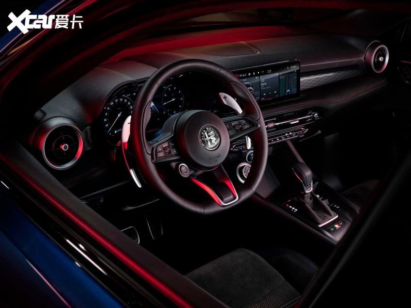 內(nèi)飾同樣延續(xù)了阿爾法·羅密歐家族的經(jīng)典設(shè)計(jì),啟動(dòng)按鈕設(shè)計(jì)在方向盤上,懸浮式中控屏尺寸為10.25英寸,并支持無線CarPlay和百度CarLife功能。