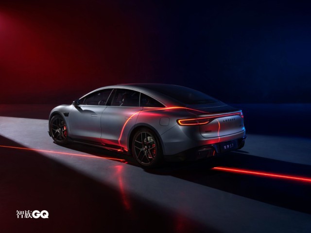 新車側(cè)面造型較為飽滿、流暢,略微向下傾斜的車頂線條搭配隱藏式車門把手和車窗邊框處的鍍鉻飾條進行點綴時尚感較強。此外,智界S7還配備五輻式熏黑輪圈和紅色涂裝的高性能剎車卡鉗。車尾部分,修長的貫穿式LED尾燈組點亮后辨識度較強,鴨尾式擾流板與寬大的亮黑色后包圍組件則增強了車尾的視覺層次感。