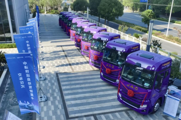 在重型商用車領(lǐng)域,江淮重卡“火力全開”,首款實現(xiàn)收費站到收費站領(lǐng)航自動駕駛功能的江淮跨越K7智能版批量交付中通快運,助力快遞快運行業(yè)智慧發(fā)展;百臺新能源重卡批量交付,也將為城市建設(shè)綠色運輸起到推動及示范作用。