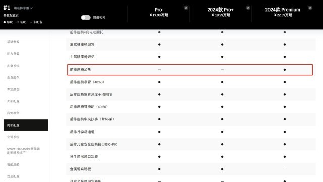 中新經(jīng)緯查詢smart官網(wǎng)發(fā)現(xiàn),前排座椅加熱等功能需要升級(jí)車型才能擁有,普通車型并未將其設(shè)為標(biāo)配。以座椅加熱功能為例,官網(wǎng)顯示,有該項(xiàng)配置的smart#1的2024款Premium為22.59萬(wàn)元起,而未將該功能設(shè)為標(biāo)配的Pro車型,其價(jià)格為17.9萬(wàn)元起。