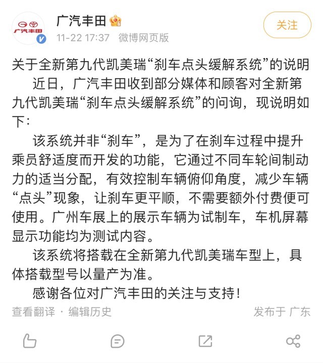 上述功能也曾引發(fā)網(wǎng)友熱議。對(duì)此,廣汽豐田公開(kāi)回應(yīng)稱該系統(tǒng)是為了在剎車過(guò)程中提升乘員舒適度而開(kāi)發(fā)的功能,并非“剎車”,也不需要額外付費(fèi)。