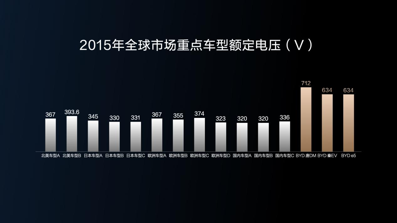 在新能源汽車普及初期,為了突破動力、續(xù)航、充電等方面的技術(shù)上限,給用戶創(chuàng)造更極致的電動車體驗,電動車高壓化的技術(shù)突破勢在必行。比亞迪率先在2015年實現(xiàn)突破,全球首創(chuàng)乘用車800V高電壓平臺,搭載在秦EV(2015款)、唐DM(2015款)等車型上。該技術(shù)可實現(xiàn)百公里加速快至4秒級,純電續(xù)航里程可達450km、快充功率提升至60kW,全方面升維用戶體驗。比亞迪800V高電壓平臺超前行業(yè)2-3代,當時,市面上的乘用車都是低電壓,只有比亞迪是高電壓。時至今日,行業(yè)競相進入800V高電壓平臺賽道。