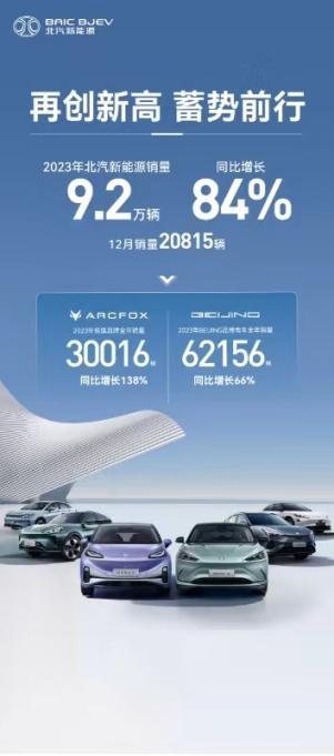 2023年,北汽藍(lán)谷銷量大幅攀升,旗下子公司北汽新能源1—12月累計(jì)銷售新車92172輛,同比增長84%。其中,12月,北汽新能源單月銷量20815輛。