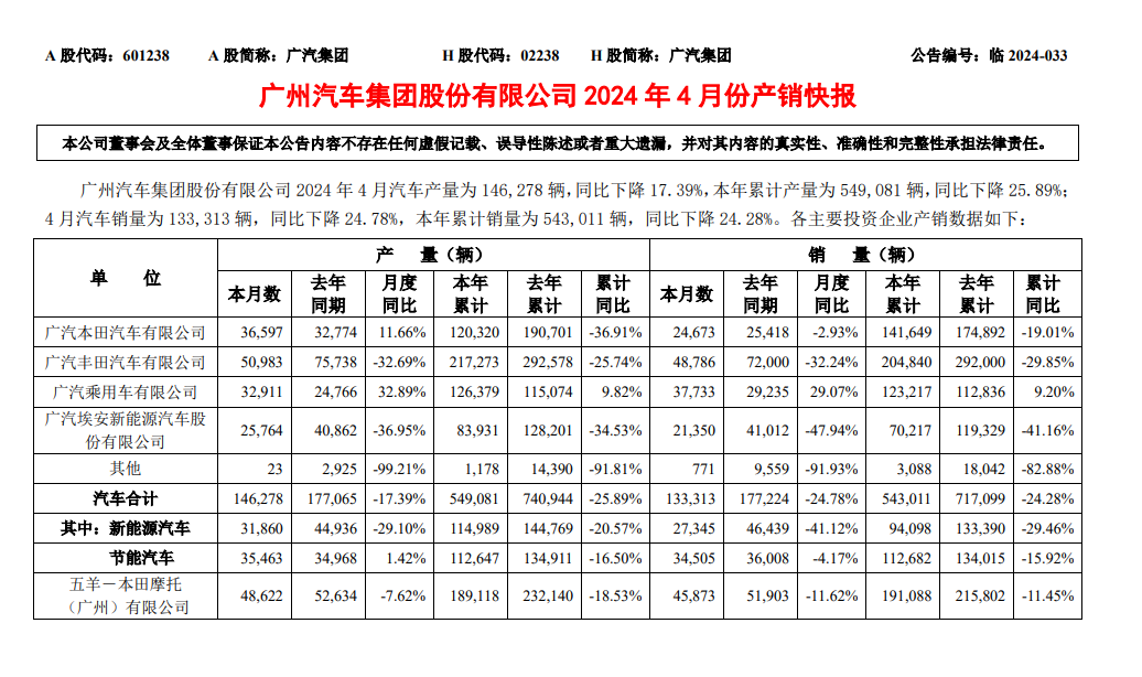 受廣汽豐田持續(xù)下滑影響,廣汽集團(tuán)市場(chǎng)表現(xiàn)同樣糟糕。根據(jù)廣汽集團(tuán)公布產(chǎn)銷量快報(bào)顯示,廣汽集團(tuán)前4個(gè)月累計(jì)銷量為 543,011輛,同比下降 24.28%。