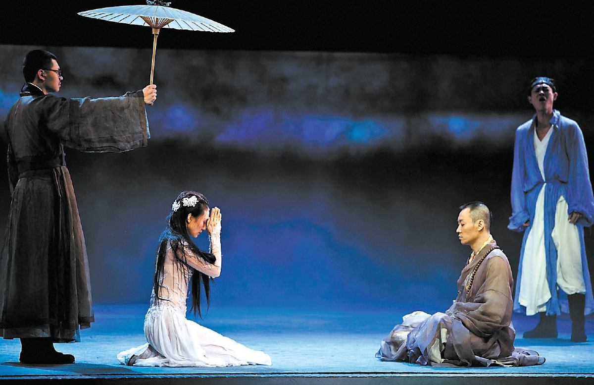 攝影/柴美林 青蛇不再被漠視 盡管視頻影像毫不意外地呈現(xiàn)出一種年代感,但這并不阻礙《青蛇》的情感表達和觀眾的沉浸體驗。當(dāng)被鏡頭放大的演員表情、行動、神態(tài)乃至服裝的紋理、妝發(fā)的細節(jié)呈現(xiàn)在屏幕上,當(dāng)秦海璐飾演的青蛇和袁泉飾演的白蛇在舞臺上眼波流轉(zhuǎn)顧盼神飛,辛柏青飾演的法海袈裟飄逸身姿如松,穿越時光的《青蛇》依舊令人心旌搖蕩。 這個蛇年堪稱“白蛇傳大年”。除了話劇《青蛇》的影像放映,同樣脫胎于李碧華小說、由徐克導(dǎo)演的電影《青蛇》4K修復(fù)版也將于本月重映。此外,上海大劇院制作的舞劇《白蛇》今年開啟2.0版巡演;上半年,廣州芭蕾舞劇院原創(chuàng)芭蕾舞劇《白蛇傳》走過12座城市;下個月,民族舞劇《白蛇傳》將在蘇州上演。 在絕大多數(shù)改編作品中,白蛇都是當(dāng)仁不讓的主角,青蛇則大多處于從屬地位,她是妹妹、是侍女,但鮮少是聚光燈下的那一個。相比于白蛇,青蛇有更強的妖性、獸性和野性,率性而為,鋒芒畢露,被視為白蛇的天然對照組。但她的形象通常缺乏主體性,有研究者認為,“她自身的幸福是被漠視和忽略的”。 云門舞集1975年出品的《白蛇傳》,可看作在改編這一傳統(tǒng)敘事方面的早期探索。劇中的青蛇不再從屬于白蛇,而成為一個完整且獨立的女性個體,并重點塑造二者對情感的追求。到了20 世紀 80年代,李碧華的小說《青蛇》徹底顛覆了傳統(tǒng)白蛇故事的情節(jié),從邊緣視角解構(gòu)廣為流傳的愛情神話。 小說中,青蛇成為許白戀情與人間情感的觀察者,以第一人稱講述她和白蛇成為人之后的情感體驗和心路歷程,這也成為故事的核心發(fā)展動力;青蛇、白蛇、許仙、法海陷入復(fù)雜的關(guān)系,構(gòu)成了以女性視角為中心的敘事。 小說展現(xiàn)出童話般愛情故事的背面,充滿了猜疑、欺騙、背叛。許仙懦弱、背信棄義的形象在一些文藝作品中已得到展現(xiàn),小說中的許仙則有過之無不及,甚至在明知青、白蛇并非人類后仍滿心算計“財色兼收,坐享其成”,最后死在小青劍下;法海以公理大義之名擄走許仙,鎮(zhèn)壓白蛇,同樣是為了滿足一己私欲。 在這個故事里,白蛇愛上許仙后,逐漸向好妻子、好女人發(fā)展,直至徹底變成干凈忠誠的“素貞”,在所謂的愛情中接受了傳統(tǒng)女性身份,完成了由妖向人的轉(zhuǎn)變。而青蛇則以一種游戲人間的狀態(tài)存在,最終看透了世間情感,又在下一個輪回中恣意率性。傳統(tǒng)講述中青蛇的野性難馴,由此轉(zhuǎn)變?yōu)楦覑鄹液?、自由獨立和對生命與情感的主導(dǎo)掌控。 法海不再是審判者 從小說來到舞臺,話劇《青蛇》在尊重原著的基礎(chǔ)上從新的視角開辟故事,將劇中四個主要角色置于人、妖、佛三個層面的糾葛之中。許仙代表最普通、最現(xiàn)實的人;白蛇、青蛇是妖,白蛇想成人,青蛇則始終記得自己是能變成人的妖;法海是想成佛的人。人、妖、佛在各自禪悟的歷程中不斷探索出路。 白蛇和青蛇學(xué)做人就是學(xué)習(xí)擁有情感、安放情感的過程。白蛇說:“我要做那一戶戶炊煙升起的人家、一扇扇亮著燈的窗戶里面,坐著的那個良家婦女?!鼻嗌邉t說:“我從踏上人間的第一步就知道,做人要快活。”她們選擇了迥然不同的道路,以不同的方式領(lǐng)悟何為情、何為人。 白蛇對于人世間的道德倫理、世俗教條樣樣學(xué)習(xí)遵守,以至于比人更像“人”。但現(xiàn)實給了她一記響亮的耳光。她毫無保留的奉獻與付出,換來的是背叛。從想成人到成為人,再到不再渴望擁有人的眼淚、人的頭腦、人的心,她主動走進雷峰塔,最終修成正果,白蛇涅槃了。而青蛇還在與法海糾纏。她對自我身份的認同比白蛇強烈牢固得多,她看得到人的種種缺點,也執(zhí)著于對法海獻祭般的、億萬斯年的精神戀愛,在他房梁上盤了五百年,直至終于擁有了“人的眼淚”。 法海是話劇《青蛇》在人物塑造上與小說的最大區(qū)別。話劇不再以青蛇的第一視角敘事,而讓法海成為故事的主要敘述者和推動者,劇中的法海不再“斬妖除魔”而是“授業(yè)解惑”,并從一開始就與青蛇緊密糾纏。他甫一出場,便用一段幽默、現(xiàn)代的臺詞自我消解了這一角色的神性。這個法海,有對病與死的畏懼、有對青蛇的搖擺、有對白蛇的不忍、有對許仙的不齒,他被摘掉了“反派”的面具,成為有血有肉的“人”。 劇中說,“覺悟就是放下,放不下就是執(zhí)著”,而放下的第一步,便是正視與接納。話劇《青蛇》講的不再是情與法的對立沖突,劇中的法海也不再是傳統(tǒng)白蛇故事里的審判者和人間理法的化身,而成為青蛇白蛇的同路人、蕓蕓眾生的代言人。在這條破除“我執(zhí)”的道路上,白蛇比法海率先參悟,而法海的執(zhí)與苦,亦是眾人皆有的“劫”。劇作擺脫了傳統(tǒng)白蛇故事中對“異類”與“他者”的審視,通過法海這一角色集中展現(xiàn)對人生出路的思索與探討,這不可簡單理解為對法海的“洗白”。 經(jīng)典不再被固化 就如劇中反復(fù)吟唱的“若無閑事掛心頭,便是人間好時節(jié)”,這首創(chuàng)作于南宋的偈詩簡單深刻,叫一代代人認同追尋。話劇《青蛇》同樣實現(xiàn)了讓古老的故事連通當(dāng)下,舞臺上演繹著宋朝的傳說,也展現(xiàn)著現(xiàn)代人