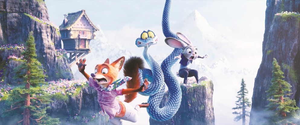 不過(guò)《瘋狂動(dòng)物城2》的“奔跑”意涵并不會(huì)上升到《羅拉快跑》的哲思層面。動(dòng)物們的一路狂奔自然也是為了成就影片的“好看”。從冰山雪川到熱帶雨林,從沙漠風(fēng)生到沼澤水起,汽車(chē)追逐要的是光怪陸離的街景,水里逃生要的是窒息壓迫的氛圍,冰雪對(duì)決要的是蒼茫一片的天地。觀眾們的視線跟隨著動(dòng)物角色的行動(dòng)高速地移轉(zhuǎn),從一個(gè)驚奇進(jìn)入下一個(gè)驚奇,從一處景觀轉(zhuǎn)入下一個(gè)景觀,這種步移景換的觀看,與他們?cè)诘鲜磕嵊螛?lè)園里進(jìn)行沉浸式大型項(xiàng)目的體驗(yàn)非常相似。只不過(guò),目迷五色的“眩暈”體驗(yàn)從5分鐘延長(zhǎng)到了100分鐘。未來(lái)的一個(gè)市場(chǎng)可能大概是,人們會(huì)有機(jī)會(huì)在某處的迪士尼樂(lè)園項(xiàng)目中重溫熟悉而親切的瘋狂動(dòng)物城記憶。