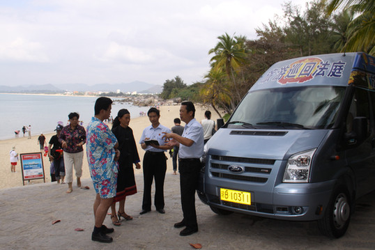 2011年初,三亞市特批專款70多萬元,為旅游巡回法庭配置兩輛巡回審判車,車上設(shè)有國徽、法臺、原被告席、當事人座椅,還配備電腦、打印機,能即時制作裁判文書。從此,兩輛可以快立、快裁、快調(diào)、快結(jié)、快執(zhí)的巡回審判車開進了三亞各個景點,真正實現(xiàn)了哪里有旅游投訴和糾紛,巡回審判車就在第一時間趕到哪里。