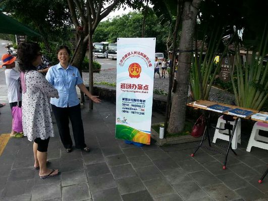 2002年4月,在充分調(diào)研基礎(chǔ)上,三亞市城郊人民法院依托天涯、崖城、藤橋3個人民法庭,設(shè)立了天涯海角、南山和亞龍灣三大國家級旅游景區(qū)旅游巡回法庭,在重大節(jié)假日全天候、平時不定期進駐景區(qū)開展法律服務(wù),巡回辦案,適用簡易程序就地化解矛盾糾紛,成為全國首創(chuàng)的“景區(qū)移動法庭”,或者被稱為“三條法庭”,即一條橫幅、一條長桌、一條長凳,景區(qū)哪里有樹蔭就移到哪里辦案。在這樣的條件下,旅游巡回法庭的法官們風(fēng)雨兼程,堅守了多年。