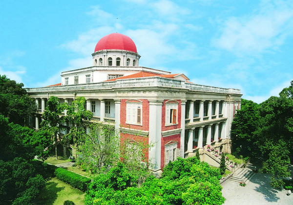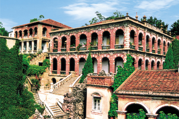 八卦樓坐落于筆架山東北的一塊臺(tái)地上,隔鷺江與廈門本島遙相互望,四圍坡地低伏,綠叢葳蕤,現(xiàn)編門牌鼓新路43號(hào),原主人乃臺(tái)灣板橋林本源家族三房林維德之次子林鶴壽,即菽莊花園園主林爾嘉的堂兄弟。 始建于1907年的八卦樓,因其紅色圓頂有八道棱線,頂窗八面朝向,又坐落于八邊形的平臺(tái)上,所以稱為“八卦樓”,造型典雅大方,中西合璧,是廈門近代建筑的代表。借鑒巴勒斯坦、希臘、意大利和中國(guó)的一些經(jīng)典建筑風(fēng)格,設(shè)計(jì)出這幢融東西方建筑文化于一體的獨(dú)特的仿古建筑。 中西建筑的藝術(shù)特質(zhì)與風(fēng)格——海天堂構(gòu) 海天堂構(gòu),現(xiàn)編門牌為福建路38號(hào)至42號(hào)。穿過門樓,眼前由近及遠(yuǎn)赫然呈現(xiàn)一大片中庭式廣場(chǎng)與四周的一大片建筑,甚為壯觀。海天堂構(gòu)大院內(nèi),一共有五幢三層式樓房,始建于1921年,占地面積約6500平方米。整個(gè)建筑群沿中軸線對(duì)稱分布:以中軸線上約700平方米左右的中庭為中心,正上方是中樓,中樓左右各有一樓,中庭前方左右各一樓;左右兩側(cè)樓房皆為西式,唯有中樓市仿古式中西合璧,形成后三前兩夾一中庭的布局。 五幢樓各具中西建筑的藝術(shù)特質(zhì)與風(fēng)格,十分精美。但從所處左右簇?fù)淼木又形恢脕砜?,中樓無(wú)疑使視點(diǎn)中心也是建筑重點(diǎn)。而中樓的建筑也的確不負(fù)其名其位,主人黃秀烺的傾心傾力傾資,完美地將其打造成“海天堂構(gòu)”建筑群中 不二樓選的形象代表。 鼓浪嶼華僑建筑——廈門裝飾風(fēng)格