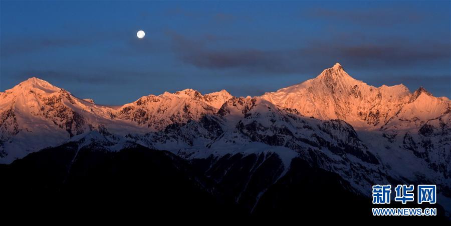 這是3月25日清晨拍攝的梅里雪山“日月同輝”景觀。梅里雪山位于滇藏交界的云南省迪慶藏族自治州德欽縣境內(nèi),是世界自然遺產(chǎn)“三江并流”的主要自然景觀之一。梅里雪山常年云霧籠罩,太陽光只在少數(shù)天晴的清晨照射在雪山頂上,形成絕美的“日照金山”美景。有時(shí)月亮尚未落山,太陽已經(jīng)升起,更是形成了難得一見的梅里雪山“日月同輝”奇觀。新華社記者 王長(zhǎng)山 攝