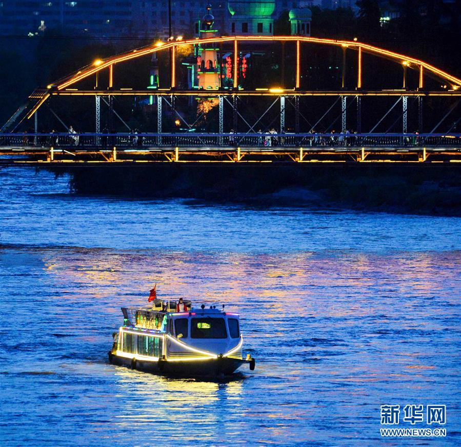 6月14日,一艘游輪從黃河蘭州段中山橋下穿過。自6月12日起,蘭州黃河游輪夏季夜航航線正式開通。據(jù)了解,作為黃河蘭州段水上旅游重點(diǎn)線路,該航線由蘭州市城關(guān)區(qū)蘭州港碼頭和白塔山碼頭始發(fā),每晚20時起開行,全程約6公里,運(yùn)行時長50分鐘左右。游客可以乘坐豪華游輪欣賞黃河夜景,感受蘭州黃河風(fēng)情線別樣魅力。新華社記者 陳斌 攝