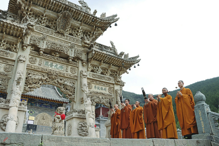 一次五臺山,五百年因緣。剛到龍泉寺108級臺階下,就聽到婉轉(zhuǎn)悠揚(yáng)又直入人心的樂曲聲從高處傳來。走到龍泉寺三寶之一的照壁抬眼向高望去,越過青石臺階,第二寶石牌坊下,一隊(duì)僧人正在演繹國家級非物質(zhì)文化遺產(chǎn)五臺山佛樂。