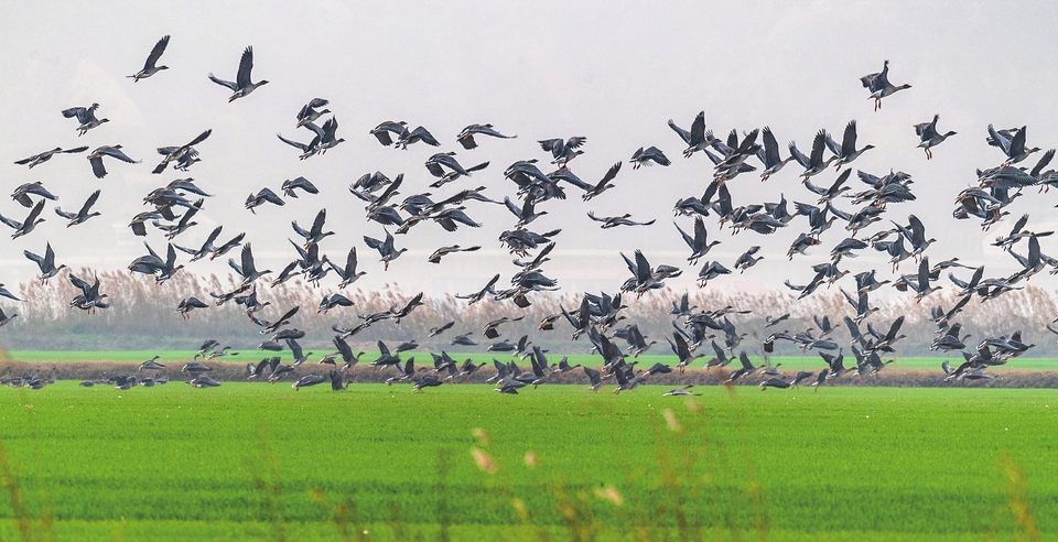 11月24日,國家二級保護動物豆雁在臨猗縣黃河濕地飛翔,給冬季的濕地注入了生機與活力。近年來,當(dāng)?shù)夭粩嗉哟簏S河流域生態(tài)保護力度,對野生鳥類開展“護飛行動”,黃河濕地生態(tài)環(huán)境越來越好,來此越冬的鳥類數(shù)量和種類逐年增加。