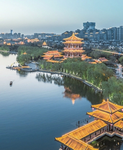 從大雁塔到大唐芙蓉園和大唐不夜城步行10分鐘—15分鐘,可以根據(jù)自己的興趣選擇。兩處都是夜游好去處,十分熱鬧。大唐芙蓉園是我國第一個(gè)全方位展示盛唐風(fēng)貌的大型皇家園林式文化主題公園,紫云樓、仕女館、杏園、芳林苑等仿古建筑,讓人感覺仿佛穿越到了唐朝,身邊穿唐裝游園的游客不少,景與人,都美得好似“世外桃源”,拍照打卡的游客,忙得不亦樂乎。如果想要體驗(yàn)更多煙火氣,那大唐不夜城的三步一景、五步一鬧無疑是最合適的選擇。每到黃昏,四面八方的人流便向大唐不夜城匯聚,大家一般乘坐地鐵而來,從地鐵大雁塔站東南口出站,從北往南參觀??赐甏笱闼睆V場(chǎng)的音樂噴泉表演,繼續(xù)往前800米,就是大唐不夜城步行街北入口,經(jīng)過古詩詞街時(shí),一步一詩詞,成為獨(dú)屬于長安的浪漫。