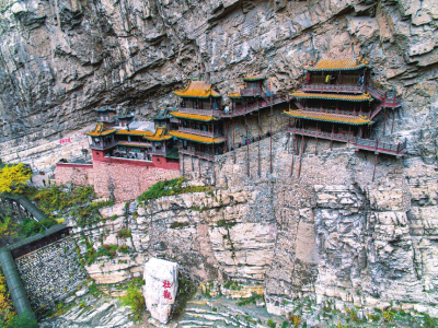 懸空寺位于恒山第二主峰翠屏峰的半崖峭壁間,始建于北魏后期,距今已有1500多年的歷史。整個(gè)建筑上載危巖,下臨深谷,樓閣懸空,結(jié)構(gòu)奇巧,是我國(guó)古建筑中罕見的杰作,堪稱“天下一絕”。詩(shī)仙李白游懸空寺后揮毫寫下“壯觀”二字,以表其懷。明代旅行家徐霞客在其著作《徐霞客游記》中稱贊懸空寺為“天下巨觀”。歷史文化名城保護(hù)委員會(huì)副主任、著名文物專家鄭孝燮視察懸空寺后題詞:“懸空寺玄、絕、奇、險(xiǎn),百來百看不厭”。