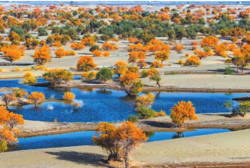 在新疆和田地區(qū)和田縣翡翠湖,成片胡楊林坐落其中。